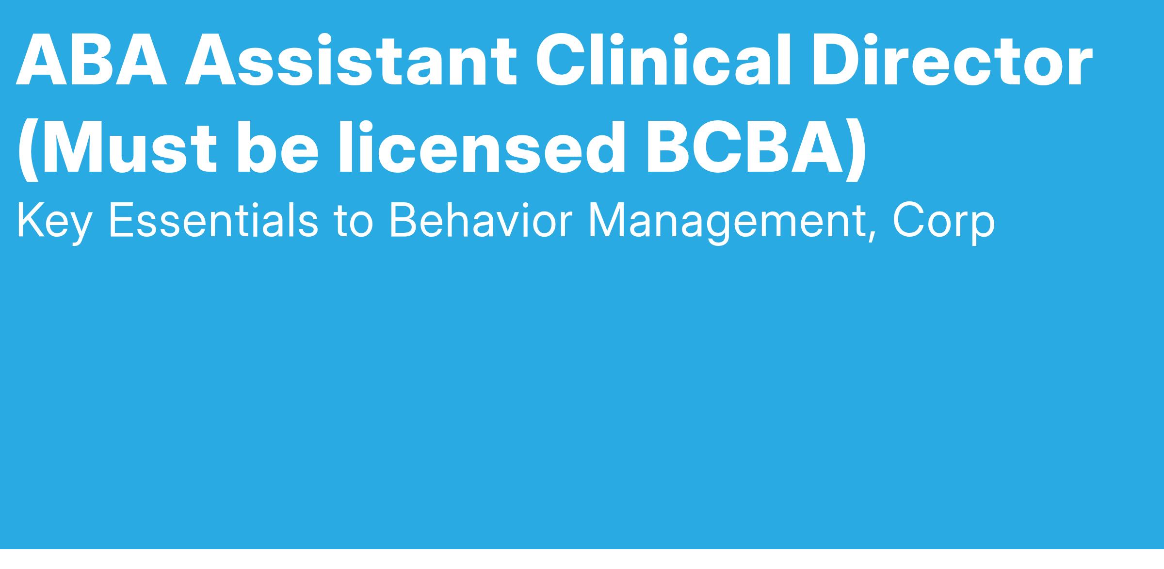 This job description is intended to convey information essential to understanding the scope of the Assistant Clinical Director role at Key Essentials to Behavior Management. It is not an exhaustive list of responsibilities, skills, duties, or qualifications associated with the position and may be subject to change in accordance with the organization's needs.