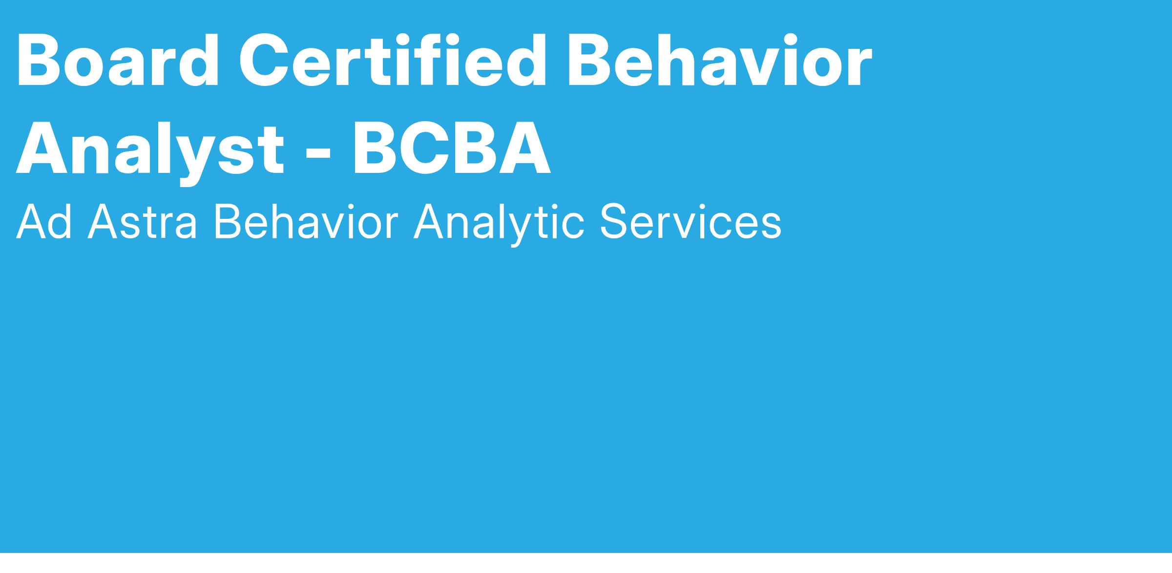 To learn more about Ad Astra Behavior Analytic Services and join our mission, visit www.adastrabas.com. Ad Astra Behavior Analytic Services is an Equal Opportunity Employer and welcomes all qualified applicants.