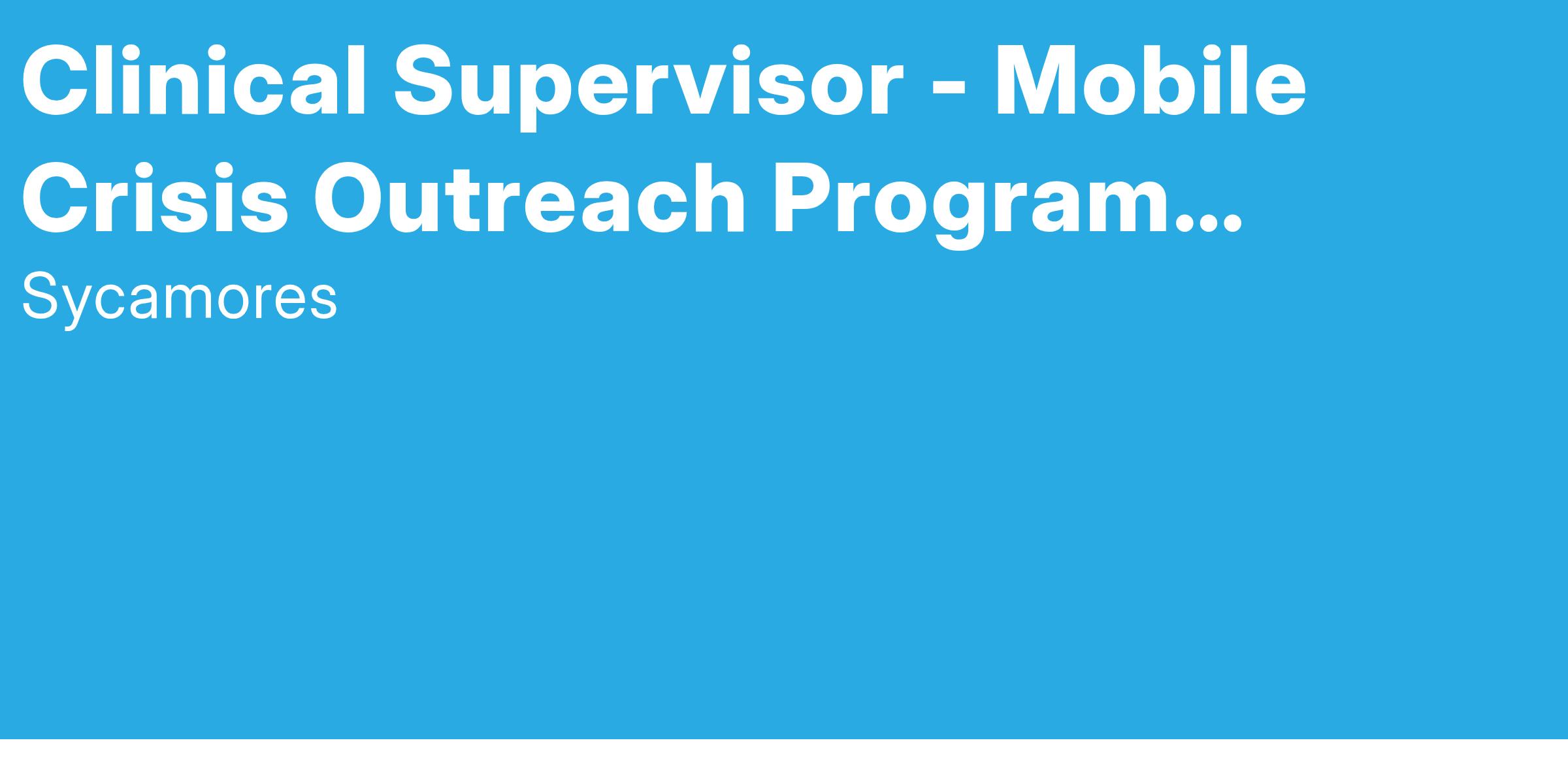 JOB SUMMARY: Sycamores is partnering with the 988 mental health crisis hotline to provide support to people experiencing a mental health crisis. The 988 hotline will provide initial phone support to all callers and triage calls to the Sycamores Mobile Crisis Outreach Program for in-person support. The Mobile Crisis Outreach Program will respond out to the community to provide timely support including crisis stabilization, safety planning, assessment for danger to self/ others, and gravely disabled write 51/50 holds as needed and provide follow up support. The Clinical Supervisor will provide support and supervision to the Mobile Crisis Outreach Program and be an integral part of the Sycamores larger Mobile Crisis Outreach Program. Close partnership with the 988-call center, Riverside County Dispatch Center, police, sheriff, psychiatric hospitals, and ambulance transport companies will be important in this role.