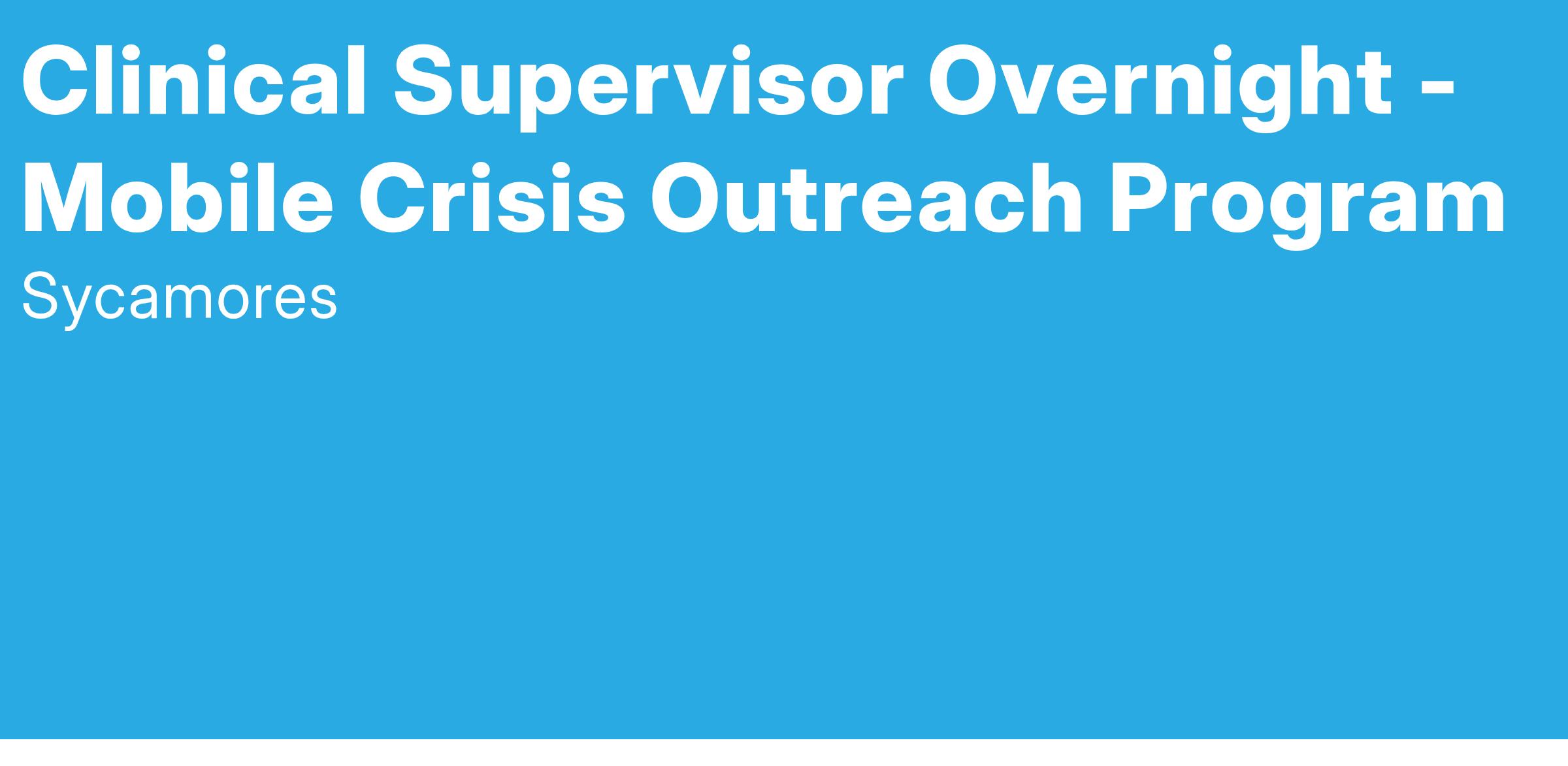 JOB SUMMARY: Sycamores is partnering with the 988 mental health crisis hotline to provide support to people experiencing a mental health crisis. The 988 hotline will provide initial phone support to all callers and triage calls to the Sycamores Mobile Crisis Outreach Program for in-person support. The Mobile Crisis Outreach Program will respond out to the community to provide timely support including crisis stabilization, safety planning, assessment for danger to self/ others, and gravely disabled write 51/50 holds as needed and provide follow up support. The Clinical Supervisor will provide support and supervision to the Mobile Crisis Outreach Program and be an integral part of the Sycamores larger Mobile Crisis Outreach Program. Close partnership with the 988-call center, Riverside County Dispatch Center, police, sheriff, psychiatric hospitals, and ambulance transport companies will be important in this role.