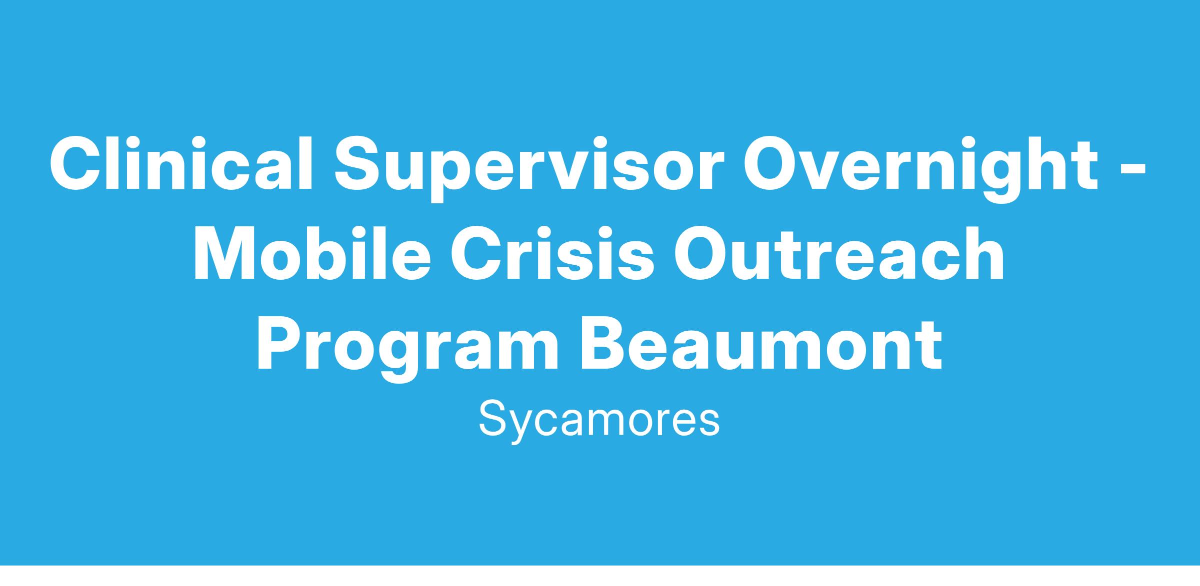 JOB SUMMARY: Sycamores is partnering with the 988 mental health crisis hotline to provide support to people experiencing a mental health crisis. The 988 hotline will provide initial phone support to all callers and triage calls to the Sycamores Mobile Crisis Outreach Program for in-person support. The Mobile Crisis Outreach Program will respond out to the community to provide timely support including crisis stabilization, safety planning, assessment for danger to self/ others, and gravely disabled write 51/50 holds as needed and provide follow up support. The Clinical Supervisor will provide support and supervision to the Mobile Crisis Outreach Program and be an integral part of the Sycamores larger Mobile Crisis Outreach Program. Close partnership with the 988-call center, Riverside County Dispatch Center, police, sheriff, psychiatric hospitals, and ambulance transport companies will be important in this role.