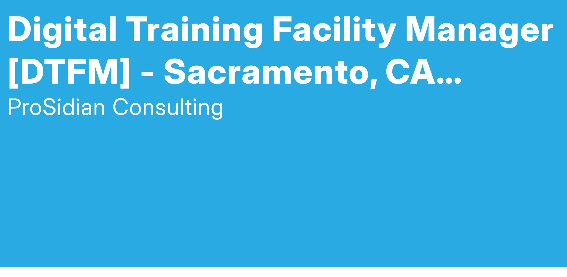 ProSidian Seeks a Digital Training Facility Manager [DTFM] - Sacramento, CA (CONUS ) - Digital Training Facility Management (DTFM) (DTFM055) to support an engagement for a training directorate of the USG that supports training and readiness of active and reserve military and personnel through planning, facilitating, managing, recording and assessing training OBO The Training Management Directorate (TMD). This DoD/Military Sector Role is a W-2 Employee Labor Category Position located at or near Sacramento, CA - CONUS | AC/RC: RC | ACOM: USARC.