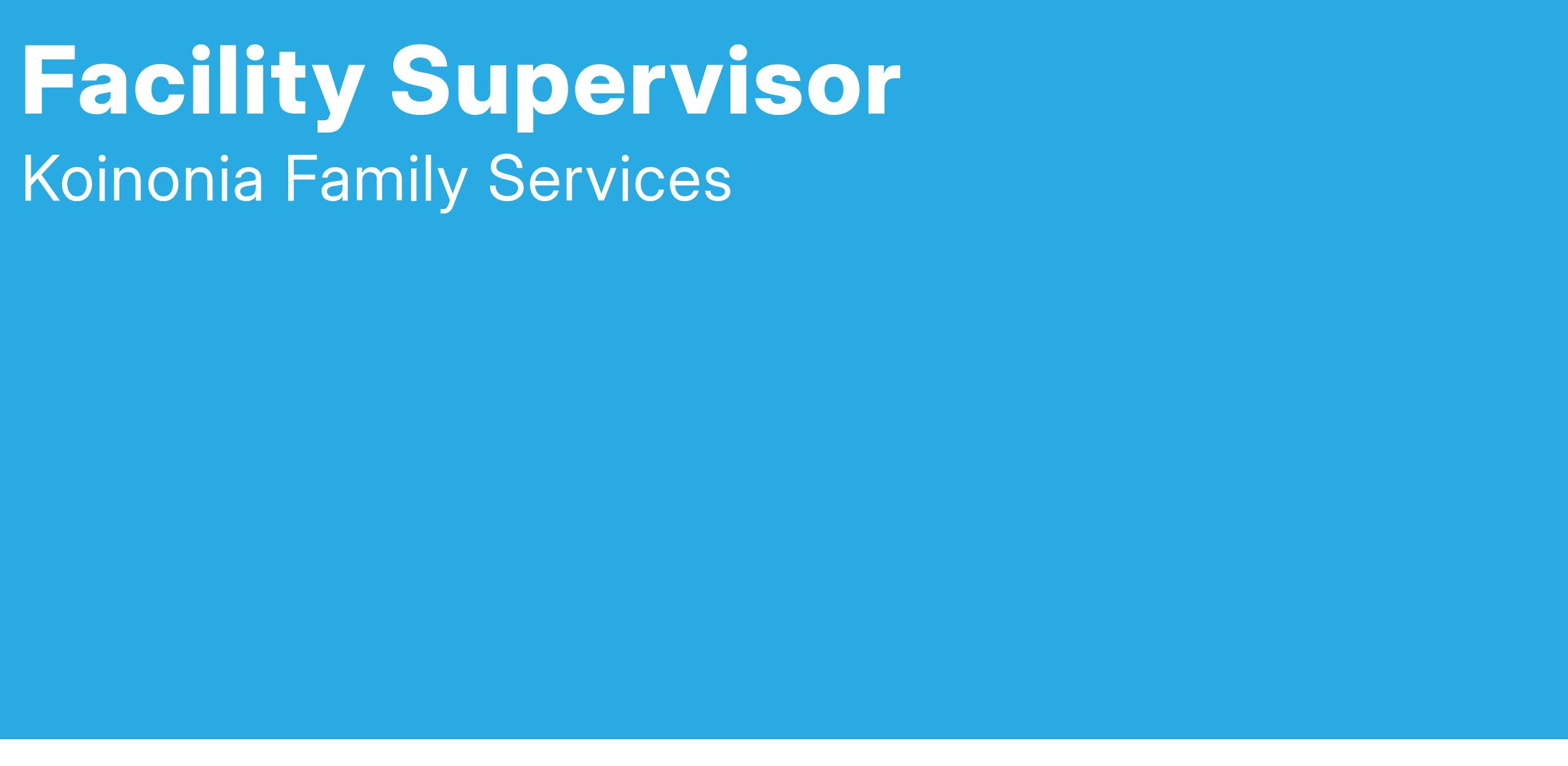 This position requires a valid driver's license, auto insurance, and reliable transportation, as driving is an essential job function. The Facility Supervisor is responsible for tasks in support of the facility that involve driving. The role may also require transporting staff, clients, or materials to sites, some of which are not easily accessible by alternative transportation methods. The nature of these responsibilities necessitates the ability to drive to ensure timely, reliable, confidential, and effective support for the youth and families we serve. Koinonia Family Services is an equal-opportunity employer.