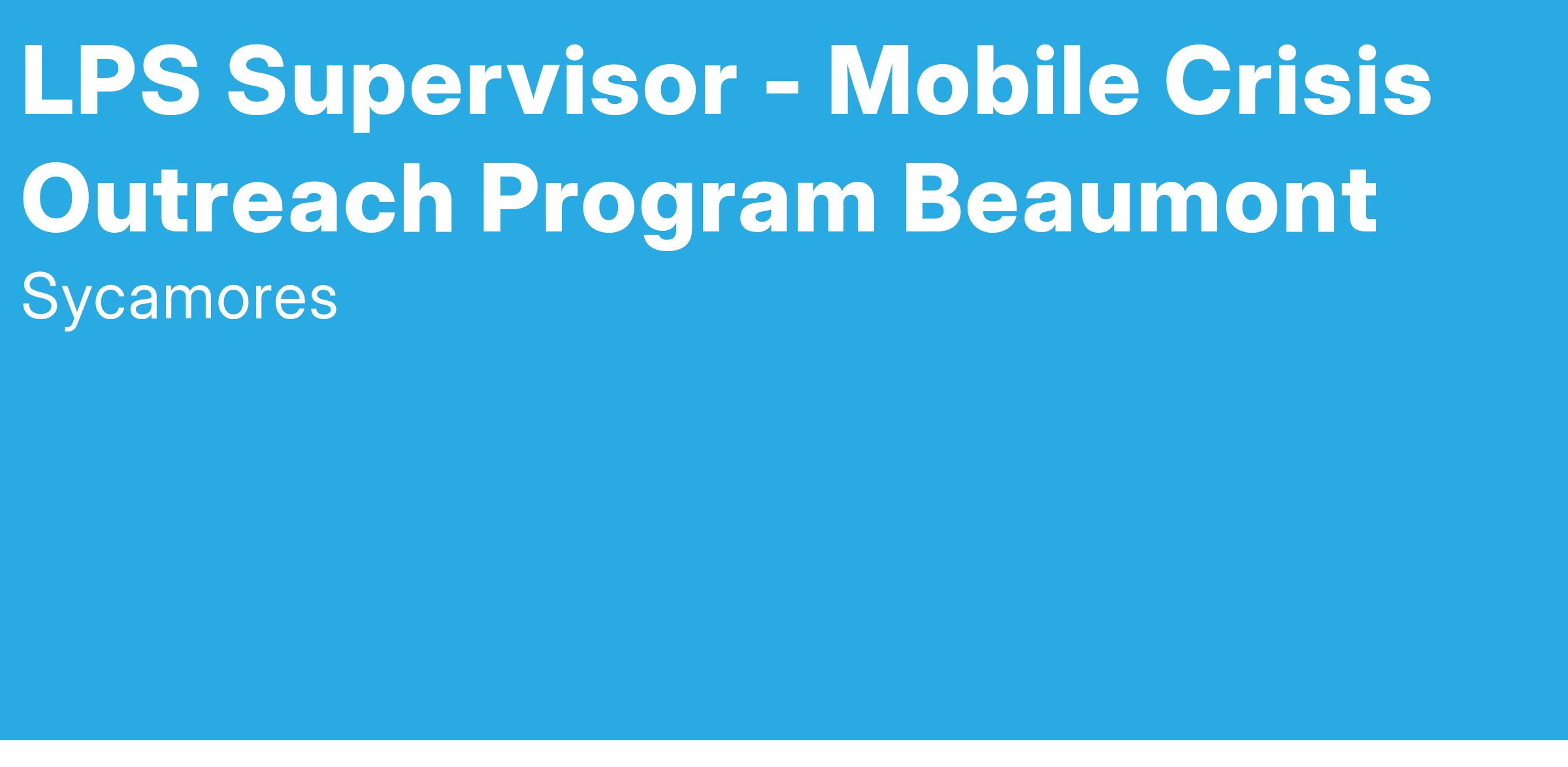 JOB SUMMARY: Sycamores is partnering with the 988 mental health crisis hotline to provide support to people experiencing a mental health crisis. The 988 hotline will provide initial phone support to all callers and triage calls to the Sycamores Mobile Crisis Outreach Program for in-person support. The Mobile Crisis Outreach Program will respond out to the community to provide timely support including crisis stabilization, safety planning, assessment for danger to self/ others, and gravely disabled write 51/50 holds as needed and provide follow up support. The LPS Supervisor will provide support and supervision to the Mobile Crisis Outreach Program and be an integral part of the Sycamores larger Mobile Crisis Outreach Program. Close partnership with the 988-call center, Riverside County Dispatch Center, police, sheriff, psychiatric hospitals, and ambulance transport companies will be important in this role.