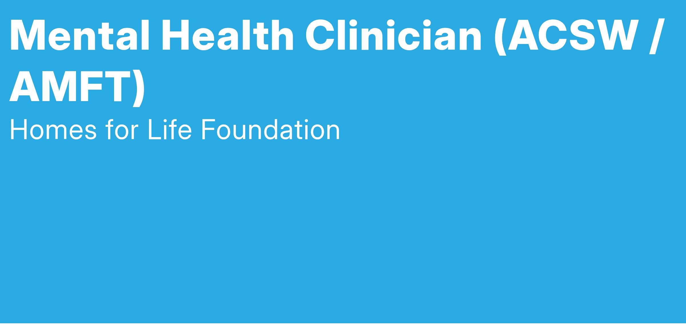 Description Since 1987, Homes for Life Foundation (HFLF) has established a network of permanent, affordable, service-enriched housing in Los Angeles County for individuals who suffer from persistent mental illness and homelessness. HFLF is seeking a Mental Health Clinician (ACSW or AMFT) to manage a caseload of up to twelve residents living in state-licensed Adult Residential Facilities (ARFs) located in Torrance, California. This is a full-time position, Monday - Friday, 9am - 5:30pm, with on-call responsibilities for crisis response including evenings, weekends, and holidays. Clinical supervision provided!