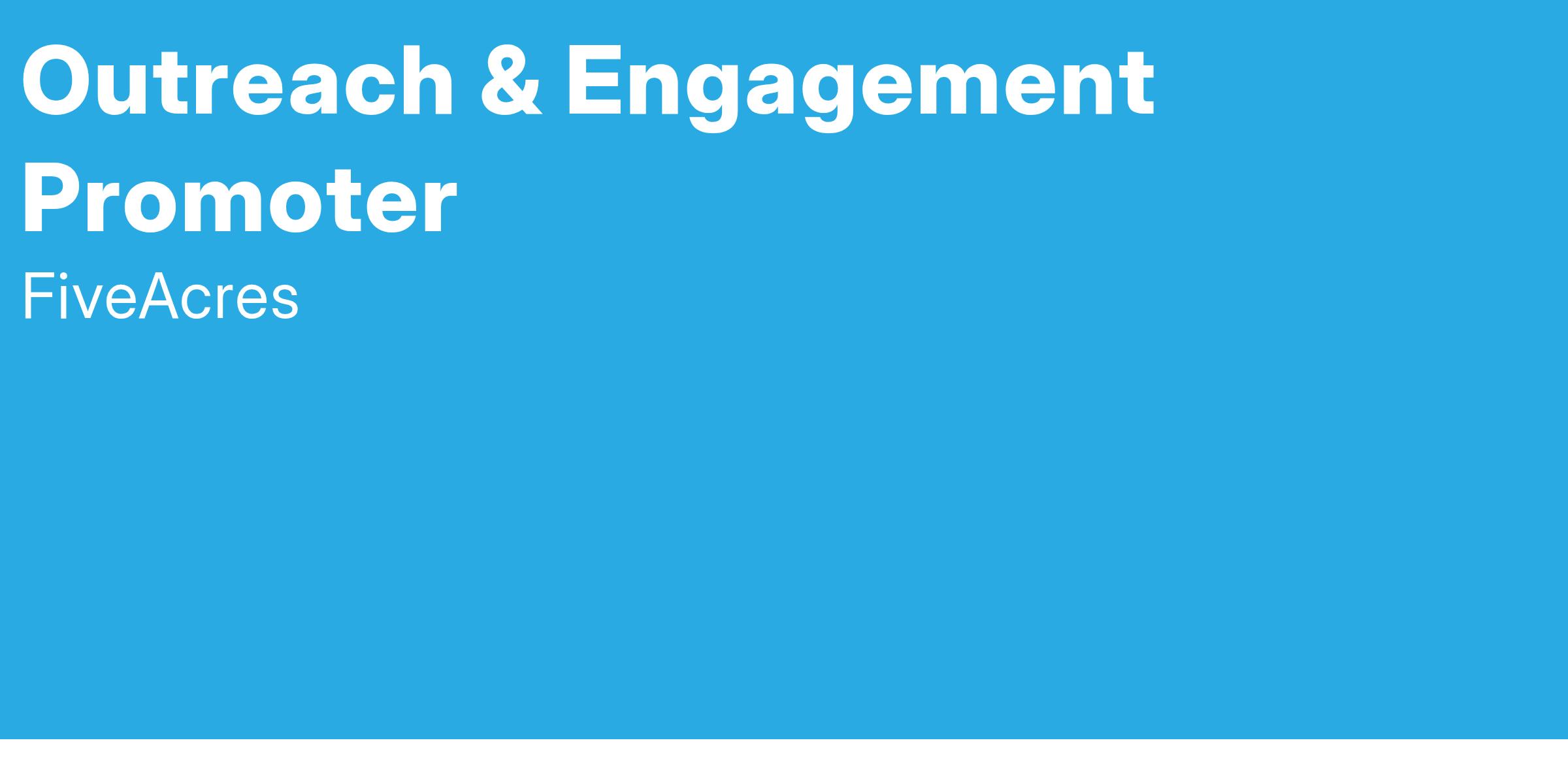 - distributing educational materials, and additional activities/events as directed to increase awareness of Five Acres, increase referrals, and deepen relationships. Must be able to attend public events in both indoor and outdoor venues in all weather conditions.