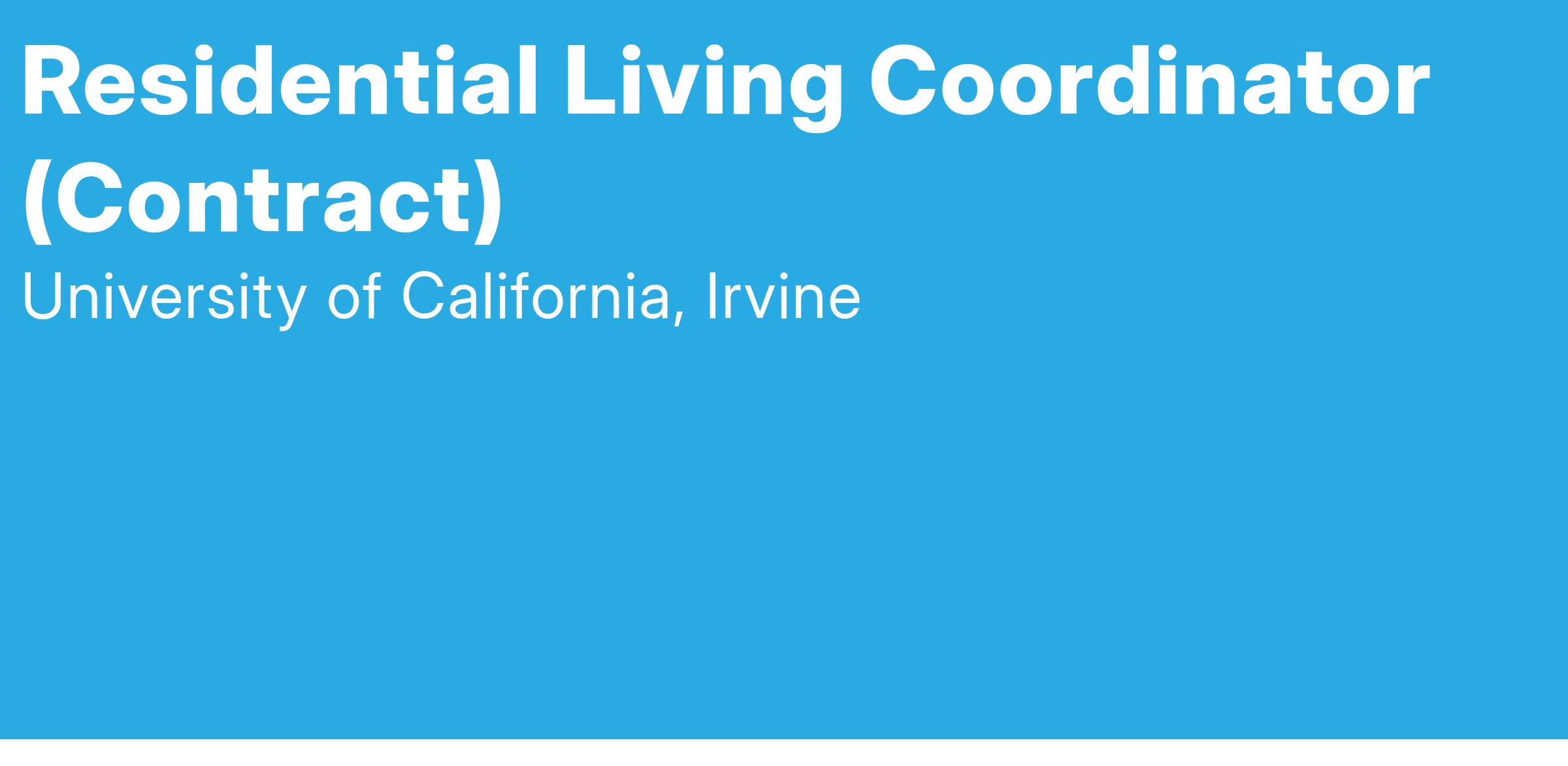Under the direction of the Associate Director of Residence Life, the Residence Living Coordinator shares responsibility for after hour emergency and crisis response in a diverse community setting. Assist in the development of community through connecting with residents, supervising student staff, programming, advising groups, managing projects, adjudicating student conduct and administrative duties, this will be a visible and important position in developing the residence community. Overall responsibilities include the selection, training, supervision, and evaluation of student staff (Resident Advisor and others as applicable, oversight of programming, budget management, counseling and referring students (individually and in groups) assisting with residence hall classes, committee work within housing and with other student service offices; and working cooperatively with other campus agencies such as UCI Police Department (UCIPD), Counseling Center, and Health Services. The Residence Living Coordinator will assist the Associate Director in the development of the overall Residence Life program within student housing. This is a Student Housing position, initial assignment is community based, and may be changed depending on departmental needs.Qualifications:Total CompensationIn addition to the salary range listed below, we offer a wealth of benefits to make working at UCI even more rewarding. These benefits may include medical insurance, sick and vacation time, retirement savings plans, and access to a number of discounts and perks. Please utilize the links listed here to learn more about our compensation practices and benefits.