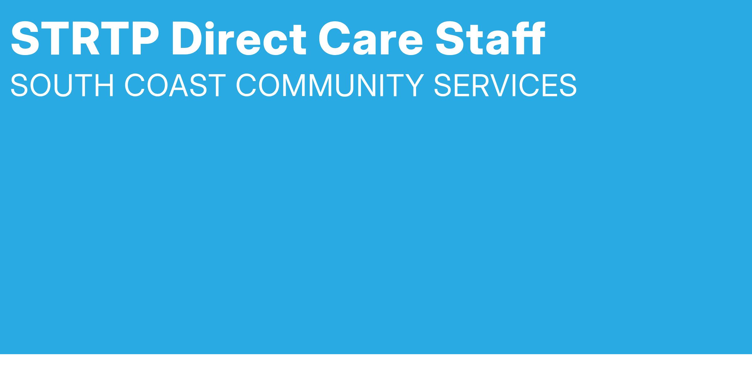 South Coast Community Services takes pride in providing our staff with competitive compensation, opportunities for professional growth, access to diverse client populations, clinical autonomy, and a strong support system of seasoned employees. Direct care staff are responsible for the supervision and general care of the STRTP residents. Direct Care staff are part of the multidisciplinary team and expected to use a trauma-informed approach to assist clients in achieving their treatment goals. Direct Care Staff must consistently monitor the physical environment to ensure safety, cleanliness, and order. Duties will also include tasks such as cleaning, preparing food, and engaging in recreational activities with the clients.